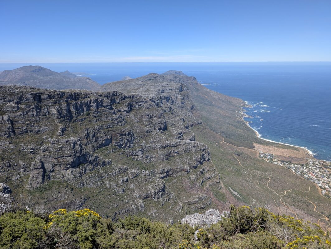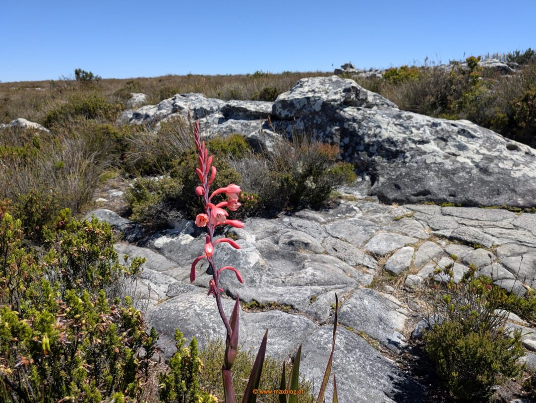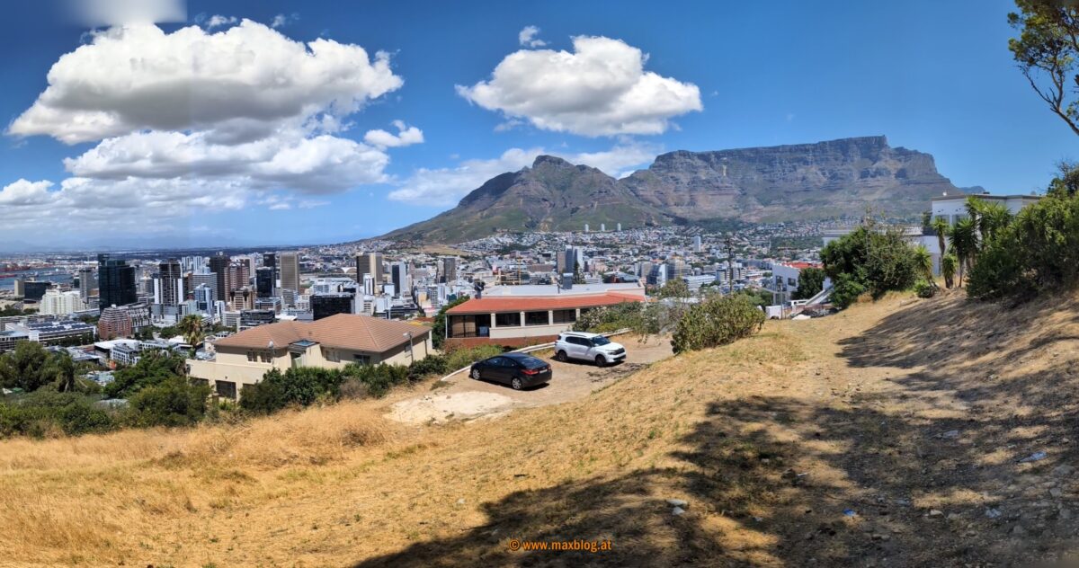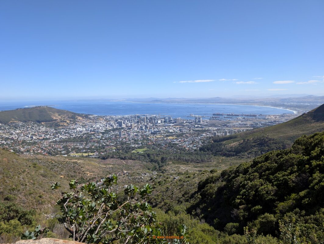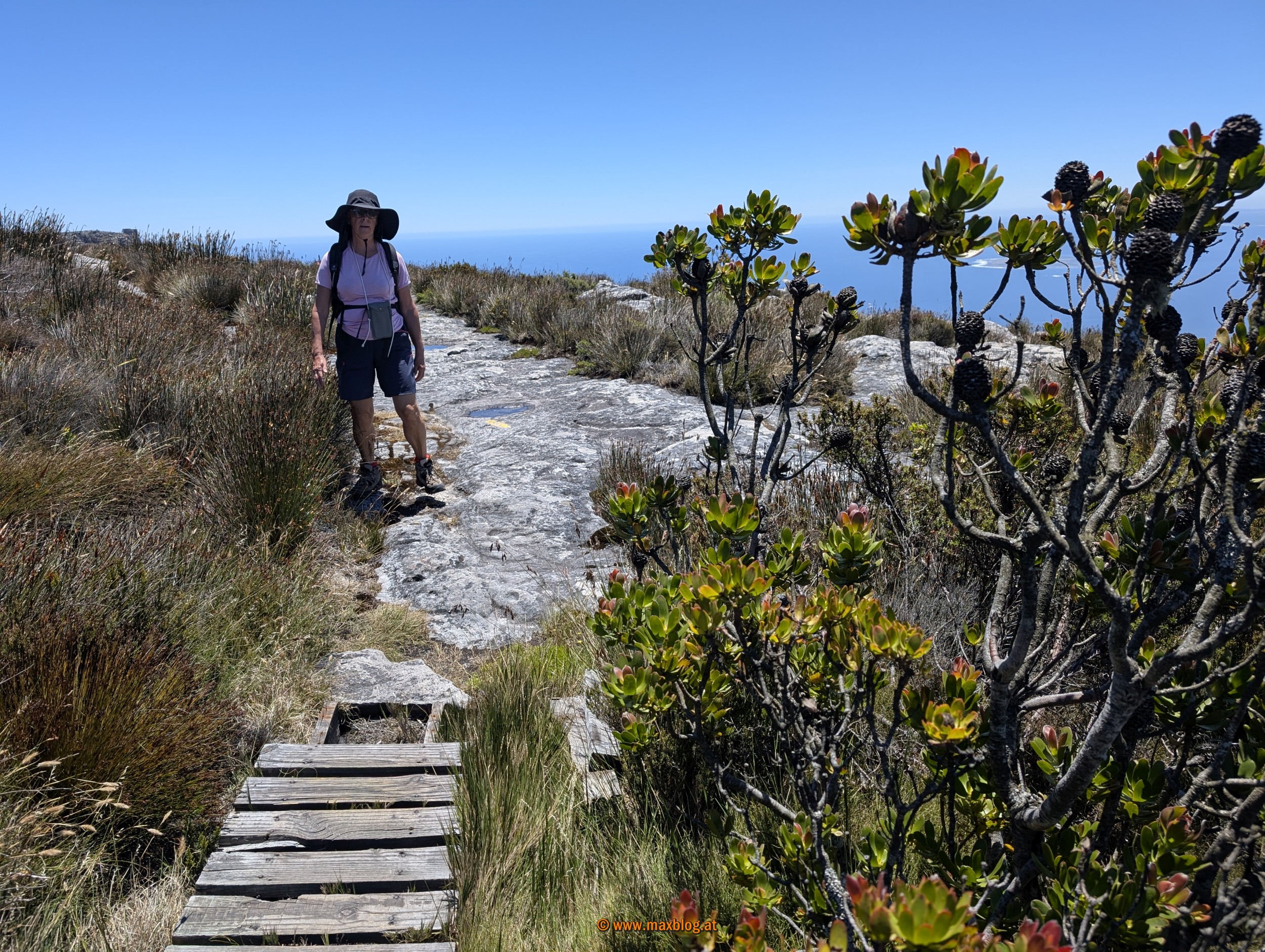 Oben erwartet uns eine Hochebene mit herrlichen Blicken in den Kessel in dem Kapstadt eingebettet liegt und natürlich aufs Meer und Robben Island, wo Nelson Mandela jahrelang eingekerkert war.