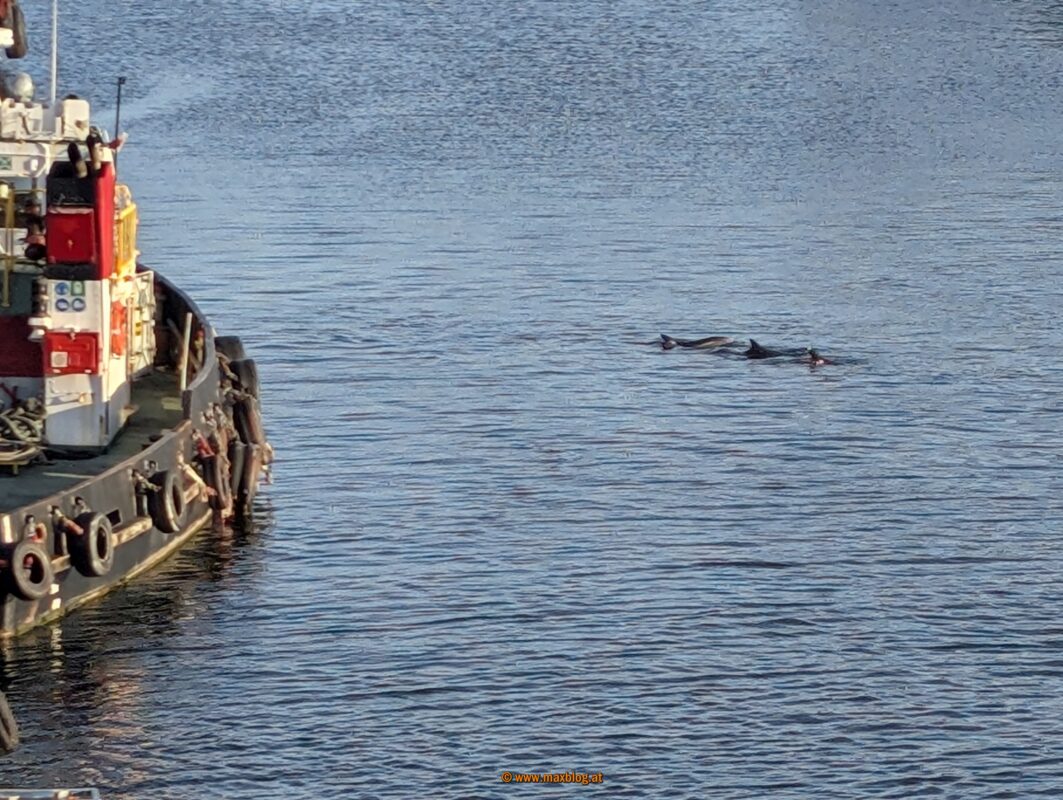 Einmal haben wir das Glück und können von einer Restaurantterrasse direkt im Hafenbecken darunter Delfine beobachten.