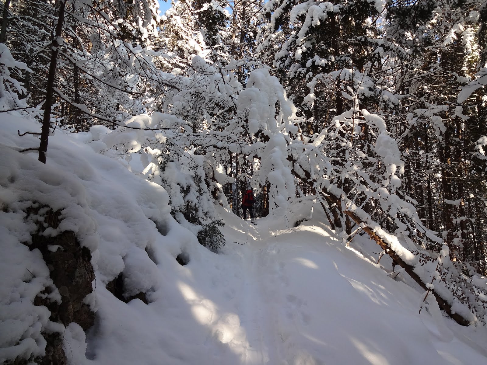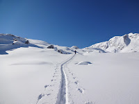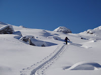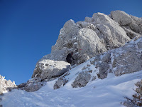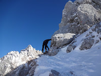 Beim sog. Kuchelnieder wird gejausnet und das Schidepot eingerichtet, denn jetzt heissts klettern. Es ist z.T. ein wenig ausgesetzt und rutschig, aber gottseidank gibt’s ein Stahlseil zum Festhalten.