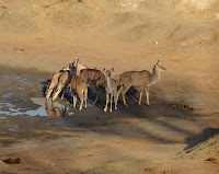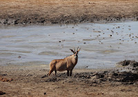 Hier im Flußtal gibt es enorm viele Tierspuren und -exkremente. Ich mache am späteren Nachmittag eine kleine Wanderung bis zu einem markanten Baobab Baum oberhalb des Trockenflusses entlang der kleinen Piste. Thompson-Gazellen und Affen kommen zum Trinken, Adler sehe ich und später auch einige Elefanten mit Jungen.