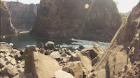 An einer ruhigen Stelle gleich oberhalb der Brücke wird eingewassert und rechts sieht man gleich den Beginn des ersten von 19 Stromschnellen.