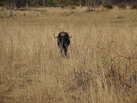 In weiterer Folge beobachten wir eine größere Herde Büffel, wir zählen etwa 150 dieser massigen Tiere. Als ich mich vorsichtig zu Fuß zu nähern versuche stellt sich ein „Aufpasser“ zwischen mich und die Herde. Es ist als ob er sagen würde „Junge, das ist nahe genug. Stop oder ich werde ungemütlich.“ Ich denke mir der klügere gibt nach…
