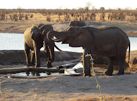 Um 02:30 Uhr wieder Lärm draußen, diesmal sind es die Hyänen. Sie müssen ganz nahe am Auto sein, so laut sind sie. Die Elefanten schlürfen noch immer an unserem Duschwasser, sind aber nicht mehr so direkt auf Tuchfühlung wie vorhin als oft kein Blatt Papier zwischen sie und dem Auto paßte.