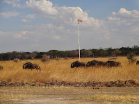 Auf sehr guten Straßen (Mautgebühr 1 US$ alle gefühlten 100-150km) erreichen wir um 15 Uhr das Main Camp des Nationalparks. Kurz davor sehen wir DikDik- und Thompsongazellen, Giraffen sowie Zebras. Dann auf der Landepiste auch noch eine Gnuherde (die erste dieser Reise) und ein Warzenschwein.