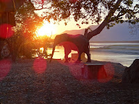 Es ist heute angenehm bewölkt, deshalb lang nicht so heiß wie gestern und das Camp ist am ersten Tag beinahe leer. Es erwartet uns eine herrliche Flusslandschaft und wir sind schon sehr gespannt, welche Tiere unsere Wege kreuzen werden. Auf dem halbstündigen Fußmarsch ins Rangeroffice probt ein Elefant gleich einmal einen Scheinangriff auf mich, mitten im Camp! Imponiergehabe mit Trompeten und heftiges Ohrenwacheln gehören da dazu. Ich bleibe aber cool und diese erste Begegnung mit einem Elefanten geht gut aus. Um 19:30 Uhr fallen wir todmüde ins Bett.