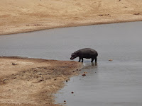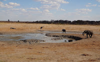 So klein das Wasserloch auch ist, leben doch 3 Krokodile und ein knappes Dutzend Flußpferde samt Jungen ständig darin. Dass die Crocs nicht verhungern ist schon klar, aber wo finden die Hippos Futter? Es ist doch jede Vegetation in weitem Umkreis längst weggefuttert.