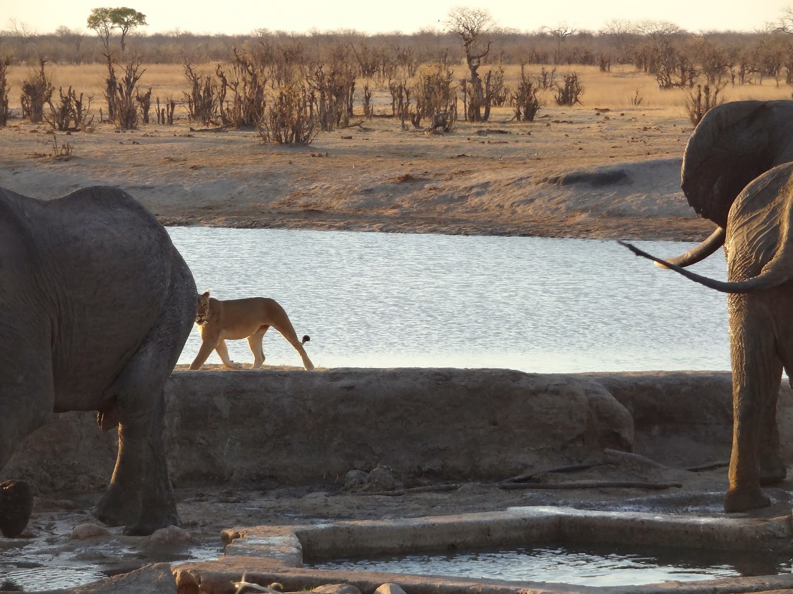 Als eine Löwin versucht sich vorbeizuschleichen weil sie zu faul zu einem Umweg um die Elefanten herum ist, werden beide von einem genervten Dickhäuter verscheucht … Von wegen Lion King! 🙂