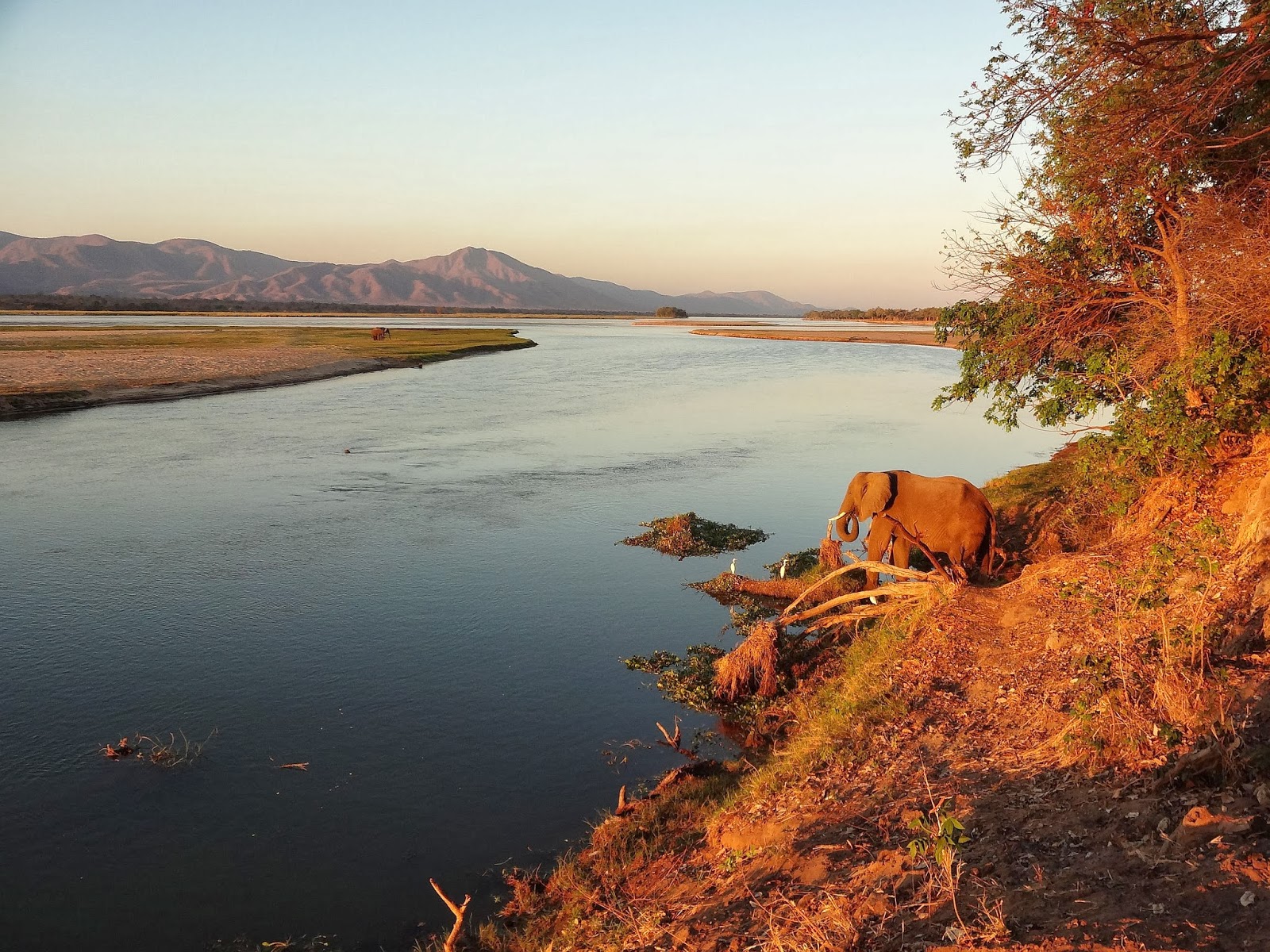 Es ist heute angenehm bewölkt, deshalb lang nicht so heiß wie gestern und das Camp ist am ersten Tag beinahe leer. Es erwartet uns eine herrliche Flusslandschaft und wir sind schon sehr gespannt, welche Tiere unsere Wege kreuzen werden. Auf dem halbstündigen Fußmarsch ins Rangeroffice probt ein Elefant gleich einmal einen Scheinangriff auf mich, mitten im Camp! Imponiergehabe mit Trompeten und heftiges Ohrenwacheln gehören da dazu. Ich bleibe aber cool und diese erste Begegnung mit einem Elefanten geht gut aus. Um 19:30 Uhr fallen wir todmüde ins Bett.