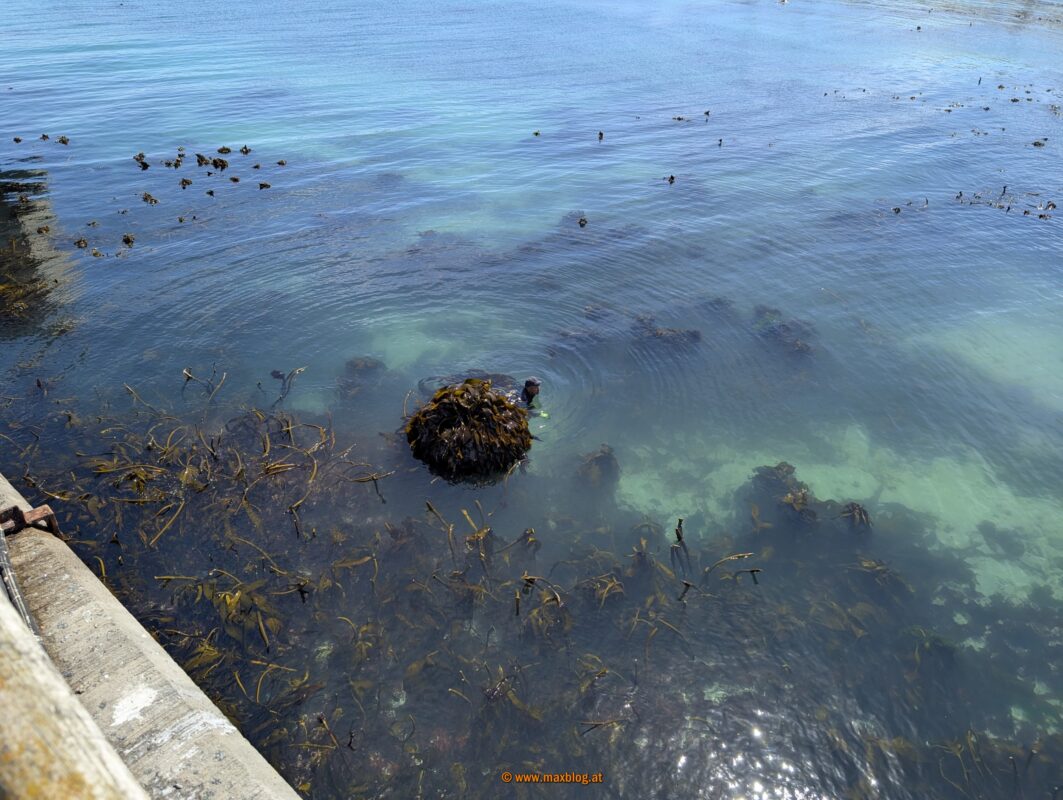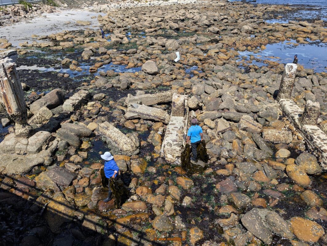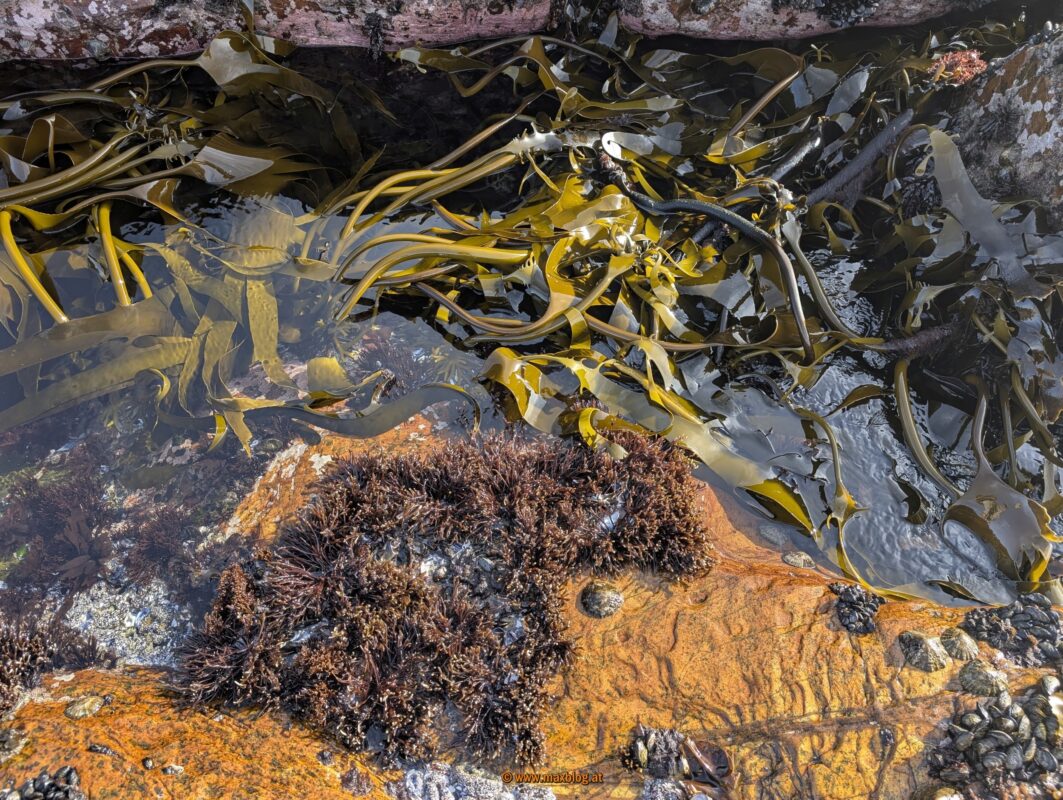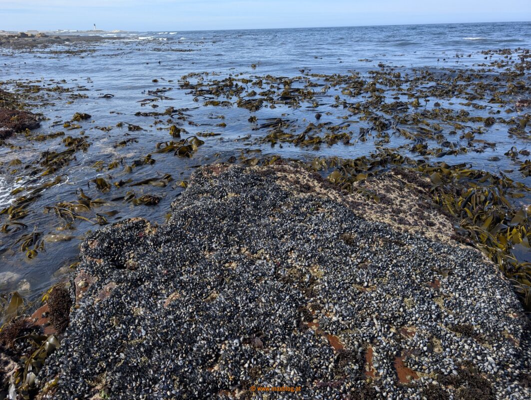 Entlang des Meeres wandern wir ein Stückerl drauflos und sehen enorm viel Seetang (Kelp) wachsen, dazu verschiedene Muschelarten, dicht an dicht.