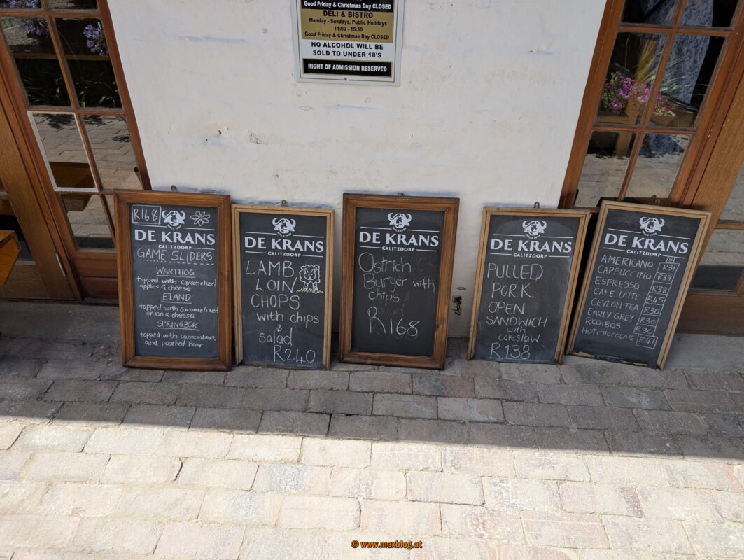 Dann zockeln wir gemütlich – bald wieder auf Asphalt – in die selbsternannte Welthauptstadt der Vogel-Strauss-Zucht, nach Oudtshoorn. In der Umgebung hat es wirklich viele Straussenfarmen, wir haben rund um Witsand aber schon mehr gesehen.